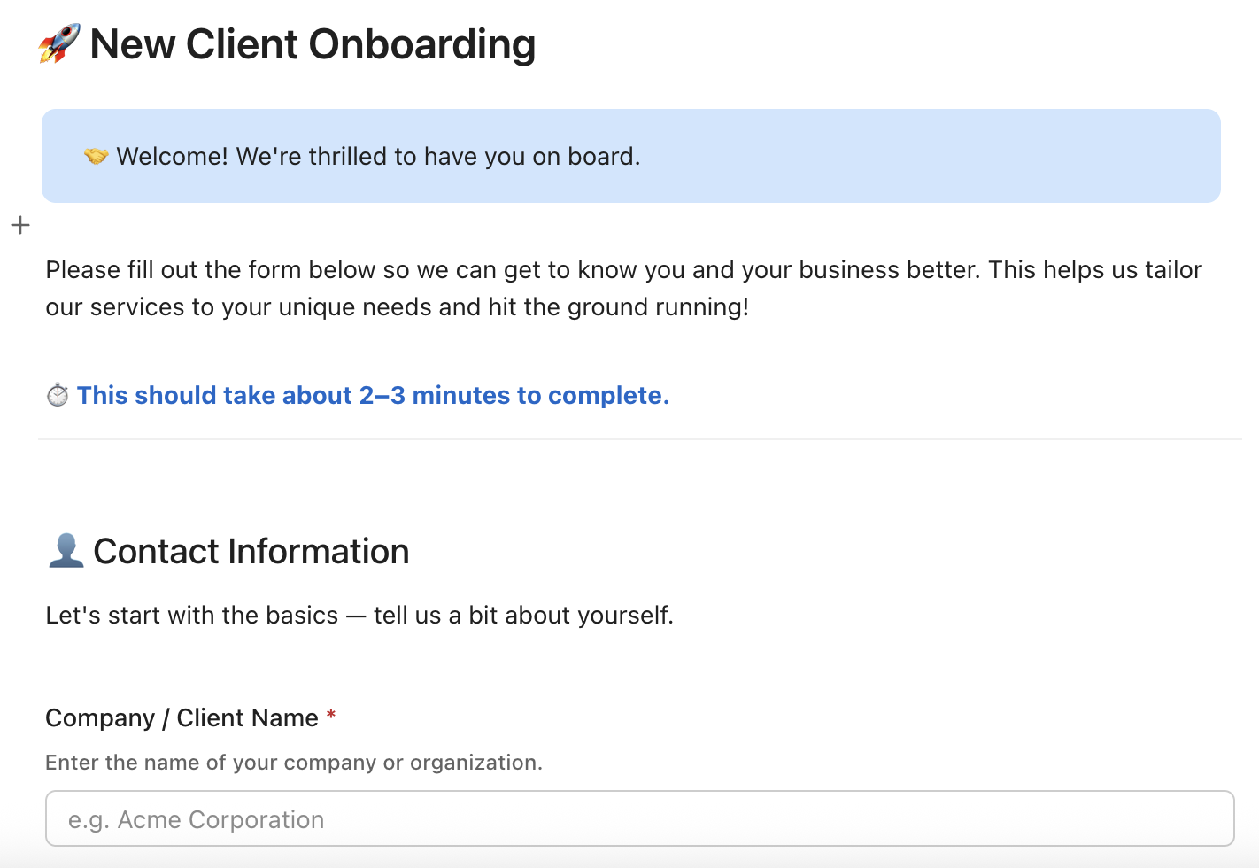 Start with the first two weeks and map the moments that create uncertainty: the missing welcome email, the unclear owner, the kickoff that gets booked without prep, the access request that never gets asked for. Then turn those moments into structure. Build one onboarding template that reflects reality. Use a form to capture the inputs cleanly. Automate the handoffs that should never rely on memory.